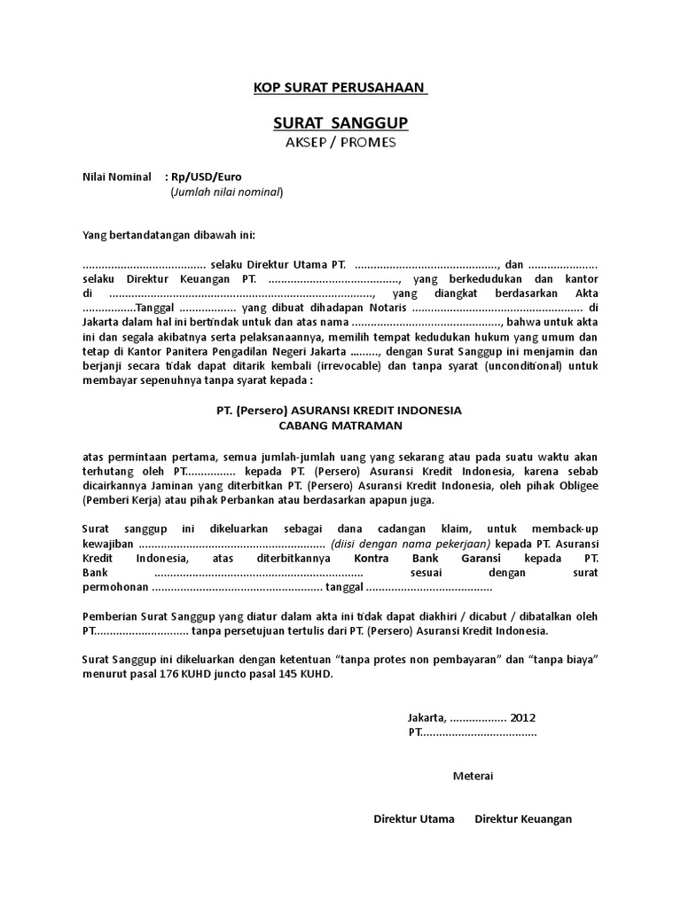 Istilah surat sanggup berasal dari istilah aslinya dalam bahasa belanda orderbrieffe, bahasa perancisnya billet a orde, bahasa inggrisnya promissory note. Pembahasan pengertian surat dan jenis jenis surat lengkap. Perusahaan pembiayaan dilarang menerbitkan surat sanggup kecuali sebagai. Dalam undang undang tidak terdapat defenisi promes, namun dari sifatnya, promes dapat digolongkan ke dalam surat tagihan hutang. Adanya tanda tangan orang yang membuat atau mengeluarkan surat. Dalam ranah properti, biasanya isinya adalah pernyataan pembeli bahwa ia sanggup melunasi pembayaran. Kata aksep berasal dari bahasa perancis accept. Pengertian dan persyaratan surat sanggup surat sanggup (promissory notes, accept, promesse aan order) adalah surat (akta) yang berisi kesanggupan seorang debitor untuk membayar sejumlah uang tertentu pada tanggal dan tempat tertentu tanpa syarat kepada seorang kreditor atau penggantinya. Tanda tangan orang yang mengeluarkan surat sanggup itu. 0 load more ads bottom ads social media facebook; Tanggal dan tempat surat sanggup itu ditandatanganinya. Jadi surat sanggup atau surat aksep adalah surat tanda sanggup atau setuju membayar sejumlah uang kepada pemegang atau penggantinya pada hari tertentu (abdulkadir muhammad, 2003 :155). Penerbit juga dinamakan sebagai debitur (orang yang berkewajiban)